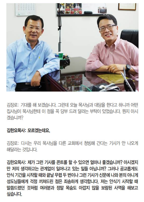 교회 기자가 "오늘 목사님과 대담을 한다고 하니까 어떤 집사님이 목사님에게 이 점을 꼭 당부 드려 달라는 부탁이 있었습니다. 다시는 우리 목사님을 다른 교회에서 청빙해 간다는 기사가 안나오게 해달라는 것입니다"라고 물었다.