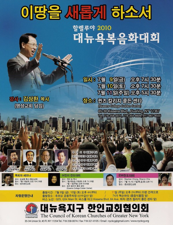 성인 대회는 김삼환 목사(명성교회)를 강사로 7월 9일(금)부터 3일간 콜든센터에서 열리며 금토일은 오후 7시 30분, 주일은 오후 5시 30분에 시작한다. 전례대로 강사 김삼환 목사는 10일(토) 오전 10시30분 퀸즈한인교회(이규섭 목사)에서 목회자 세미나를 연다.