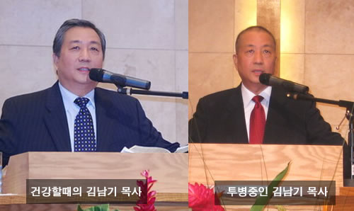 설교 하루전 동생을 면회하고 온 김남수 목사는 "김남기 목사가 19살에 백혈병에 걸려 죽을 뻔했다. 병원에서 못고치고 집으로 보냈지만 하나님의 은혜로 살았다. 49살에 두번째와 뒤에 세번째 공격이 있었지만 건강을 회복했다. 최근 4번째 공격이 있은 후 병원에 들어가 투병생활을 했다"고 말했다.