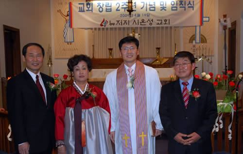 뉴저지 시온성교회(담임 안덕원 목사)가 4월 19일(주일)에 창립 2주년을 맞았다. 시온성교회는 19일 오후 5시부터 기념 예배와 함께 새로운 임직자들을 세우는 임직식을 거행하였다. 이 날의 기념 예배와 임직식은 외부 인사들을 초청하지 않고 시온성교회의 교우들과 임직자들의 가족들만 참석한 가운데 진행되었다.