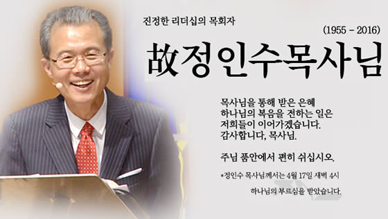 아틀란타연합장로교회 정인수 목사가 4월 17일 주일 오전 새벽 4시 갑자기 소천했다. 미국장로교뿐만 아니라 미주한인교회의 리더였던 정인수 목사는 최근 캄보디아 선교후 한국의 일정을 소화하고 지난 금요일 미국에 돌아왔다. 주일 새벽에 이상을 느껴 병원에 스스ㅁㅊ로 가서 의사에게 진단받고 처방해준 약을 복용했는데 쇼크가 온 것 같다고 소식통이 전했다.