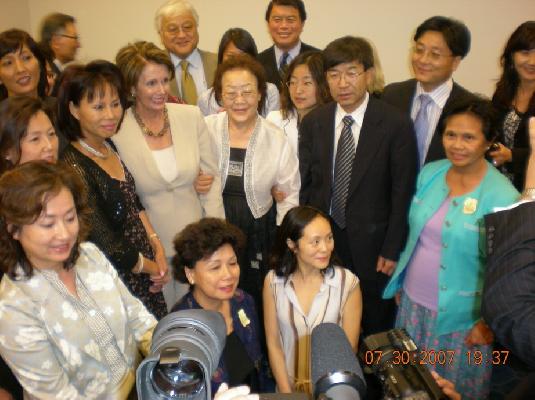 결의안 통과 직후 낸시 펠로시 의장은 우리 대표단 가운데 몇 사람을 의사당 내의 작은 회의실로 초청했다. 혼다 의원이 펠로시 의장에게 그동안 로비활동을 해온 유권자센타의 나와  이용수 할머니를 특별하게 소개해 주었다. 펠로시 의장은 할머니와 나를 감싸 안았고, 이어 악수를 한 뒤 결의안 통과에 대해 우리보다 훨씬 더 기뻐하고 감격스러워 했다. 펠로시 의장은 “이용수 할머니가 미국정치권을 올바른 리더십으로 가도록 하셨다. 정의는 이렇게 이기고, 늘 살아있다. 정의가 이기는 것은 우리 모두의 신념이다. 한인들의 풀뿌리 운동이 이렇게 셀 줄은 정말 몰랐다”고 감동에 가득 찬 표정으로 우리들을 격려했다. 그는 이어 “이제 동김(김동석의 미국식 표현)도 편안한 마음을 가져도 될 것 같다”고 이야기했다.