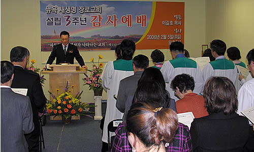 뉴욕새생명장로교회(담임 허윤준 목사)가 창립 3주년을 맞아 동료목회자들의 축하 찬양속에 감사예배를 2006년 2월 5일(주일) 오후 5시에 드렸다. 이날 감사예배는 인도 허윤준 목사, 기도 허윤제 목사(하나장로교회), 성경봉독 홍춘식 목사(오메가 선교교회), 말씀 이길호 목사(주사랑장로교회), 특별찬양 목사회 중창단, 헌금특송 박성천 집사, 축사 이용호 목사(평안장로교회), 격려사 황경일 목사(뉴욕목사회 회장), 축도 황동익 목사(뉴비젼교회), 식사기도 문종은 목사(새영장로교회)로 진행됐다.