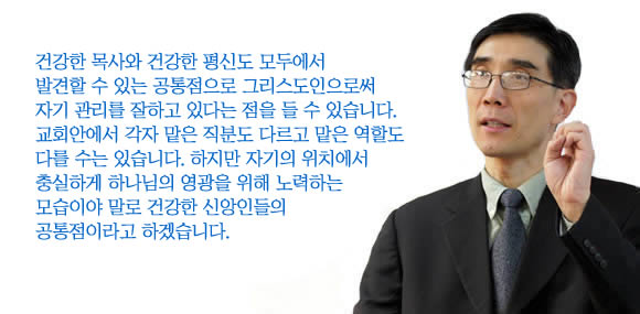 건강한 목사와 건강한 평신도 모두에서 발견할 수 있는 공통점으로 그리스도인으로써 자기 관리를 잘하고 있다는 점을 들 수 있습니다. 교회안에서 각자 맡은 직분도 다르고 맡은 역할도 다를 수는 있습니다. 하지만 자기의 위치에서 충실하게 하나님의 영광을 위해 노력하는 모습이야 말로 건강한 신앙인들의 공통점이라고 하겠습니다. 교회사적 입장에서 한 시대를 이끌었던 교회의 지도자들을 보더라도 저들의 등장이 우연이 아니라 자기 계발을 통해서 지도자로 훈련되어지고, 인정받고, 쓰임받은 것임을 알 수 있습니다. 타고난 능력으로 지도자가 된 것이 아니라 부단한 자기 성찰과 훈련으로 이루어낸 결과임을 알 수 있습니다.