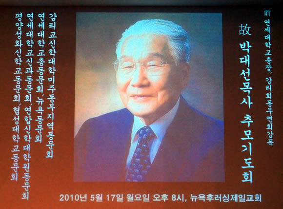 전 연세대학교 총장, 감리회 동부연회 감독 고 박대선 목사 추모기도회가 5월 17일(월) 오후 8시 후러싱제일교회(김중언 목사)에서 열렸다. 박 목사는 지난 4월 29일 94세를 일기로 소천했다.