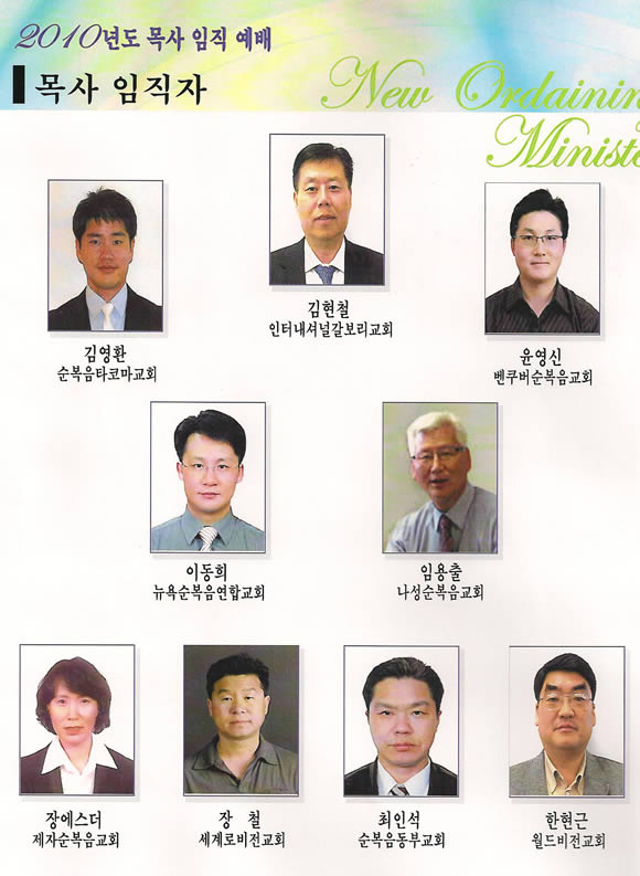 순복음 세계선교회 북미총회 2010 정기총회가 3월15일(월)부터 17일(수)까지 순복음연합교회(양승호 목사)에서 열리는 가운데 16일(화) 오후 3시30분 9명의 목사 임직예배가 열렸다.