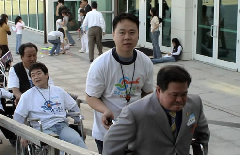 장애우들의 휠체어를 밀어줄때 반드시 도움이 필요한지를 먼저 물어야 합니다. 장애우에 따라 불안해 하는 사람도 있기 때문입니다.