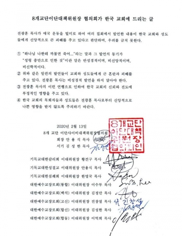 8개교단이단대책위원장들은 "위와 같은 발언들이 교회와 성도들에게 큰 혼란과 피해를 주고 있다."며 "전광훈 목사는 비성경적 발언을 하지 말아야 한다."고 촉구했다.