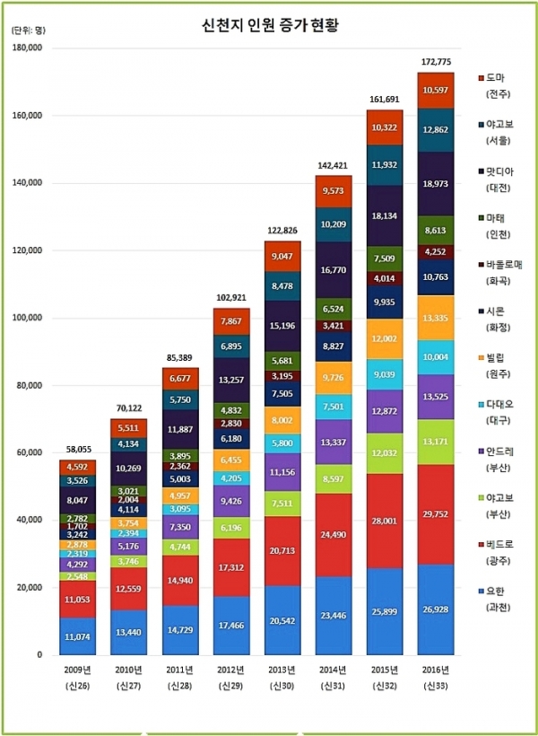 ▲ 한국기독교이단상담소협회 구리상담소가 지난 2017년 2월 공개한 신천지 증가 현황. 당시 17만2천명이었는데, 신천지 측은 3년만에 30만명이 늘었다고 주장하고 있다. © 뉴스파워 자료사진