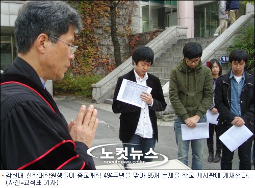 감리교신학대학교 이덕주 교수와 신학대학원생들이 이 같은 종교개혁일을 기념해 한국교회 현실을 고백하는 ‘한국교회 개혁 95개 논제’를 학교 게시판에 붙이고 한국교회 갱신과 개혁을 위해 기도하는 의미있는 행사를 가졌다.