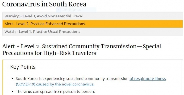 CDC는 한국에 대한 여행공지(travel health notice)를 '경계'(alert) 수준인 2단계로 조정했다.