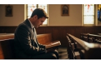 ▲ 강단 아래 홀로 앉아 고민에 잠긴 목회자의 뒷모습. 사임 위기는 줄었지만 내적 고갈은 여전하다. (AI사진)
