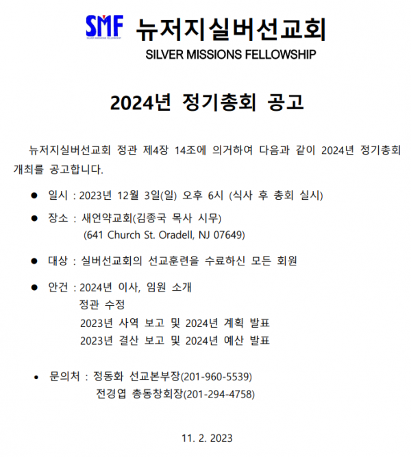 뉴저지실버선교회 2024년 정기총회 공고 페이지 정보 SWFㆍ2023-11-03 관련링크 본문 뉴저지실버선교회 2024년 정기총회 공고 댓글목록 등록된 댓글이 없습니다. 이전글 다음글 목록