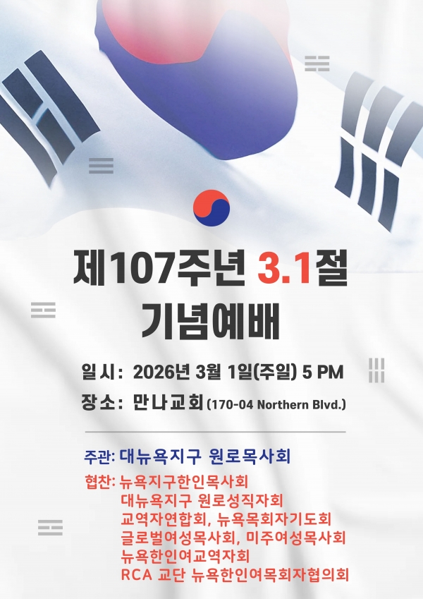 제107주년 3.1절을 맞이하여 뉴욕 교계 여러 단체가 모여 기념 예배를 드립니다.