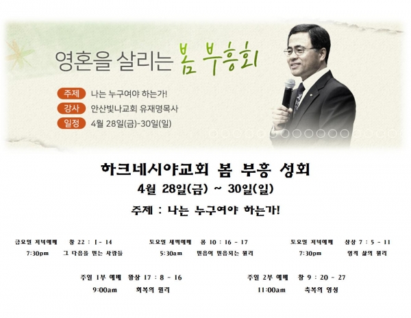 안산빛나교회 유재명 목사님을 모시고 봄 부흥성회를 가집니다.