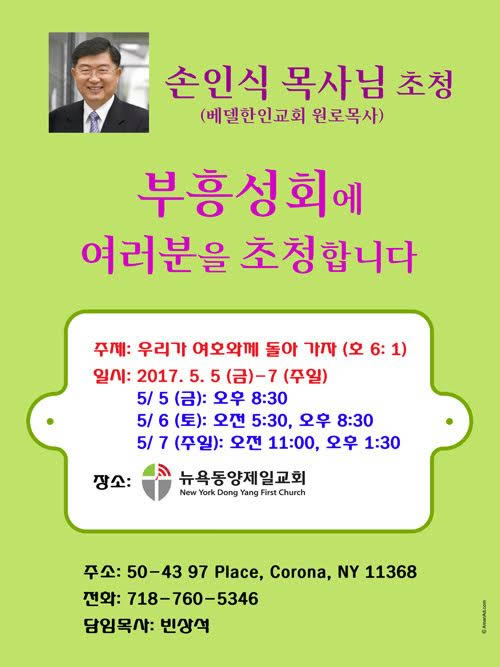뉴욕동양제일교회에서 손인식 목사님 (베델한인교회 원로목사)을 모시고 다음과 같이 부흥성회가 있습니다. 많이 참석하셔서 말씀의 은혜를 받으시기 바랍니다.