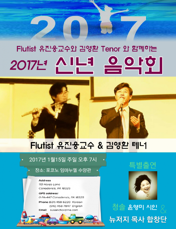 정유년 새해를 아름다운 포코노의 임마누엘 수양관에서 플루티스트 유진웅 교수와 김영환 테너와 함께하는 신년음악회에 여러분 모두를 초대합니다.