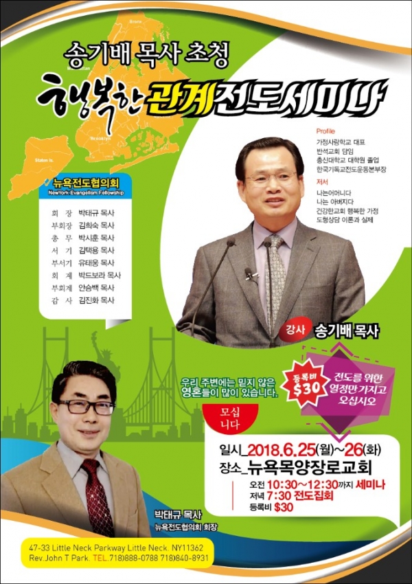 오는 6월 25, 26일(월,화) 송기배 목사 초청 행복한 관계 전도 세미나 및 집회가