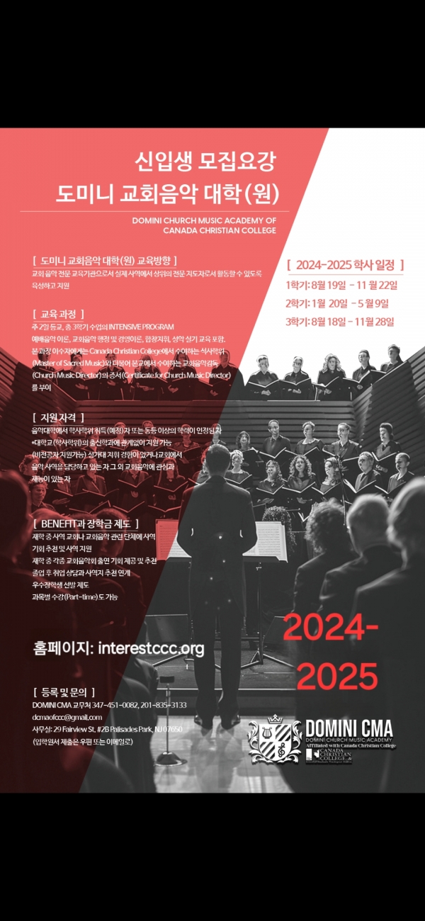 미동부 한인사회 최초로 설립된 교회음악 전문 대학원인 도미니 교회음악 대학원에서 석사과정 신입생을 모집합니다.