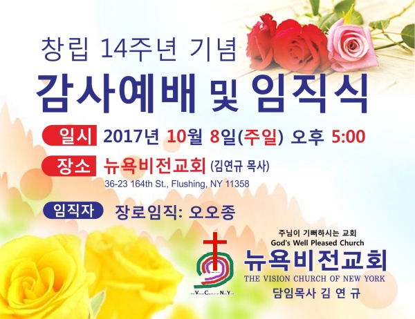뉴욕비전교회 창립14주년기념 감사예배 및 장로임직식