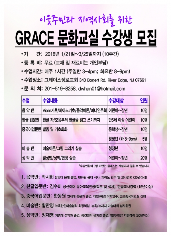 뉴저지 River Edge에 위치한 그레이스장로교회에서는 1월 21일부터 매주일 오후 3-4시까지 지역한인들과 그 자녀들을 위해서 무료 문화교실을 개설합니다.