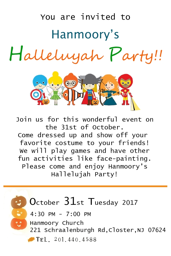 한무리교회 <2017 할렐루야 파티>가 10월 31일(화) 오후 4시30분부터 7시까지 한무리교회 새성전에서 열립니다.^^ 대상은 만 3세~6학년 입니다.