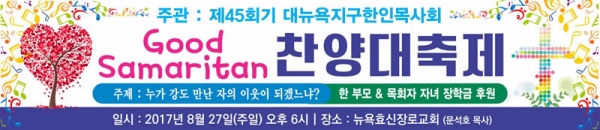 제 45회기 대뉴욕한인목사회에서는 가을학기를 앞두고 “누가 강도 만난 사람의 이웃이 되겠는냐?”(눅 10:36절)라는 주제로 성경에서 보여준 선한 사마리아인의 좋은 모범을 상기하며, Good Samaritan 찬양대축제를 통하여 한 부모 자녀 및 목회자 자녀 돕기 장학금 수여식을 갖고자 하오니 많은 관심과 사랑으로 후원해 주시고 적극 참여해 주시면 감사하겠습니다.