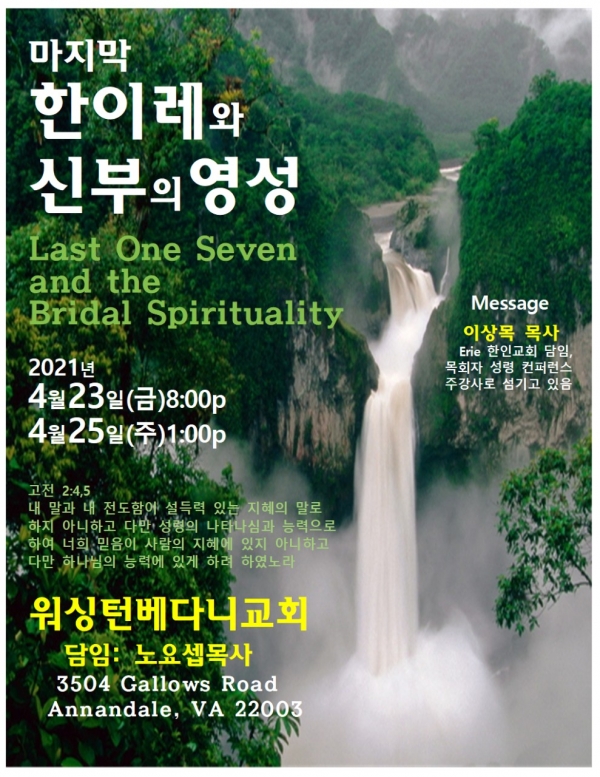 한이레의 신부영성에 관하여 집중적으로 조명하여 마지막 시대에 신부로 남은자들로 세워지는 귀한 영성 집회입니다. 많이 참여바랍니다.