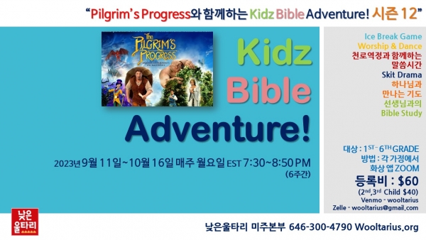 샬롬! 낮은울타리 미주본부(대표간사 : 조희창 목사)에서 ZOOM으로 만나는 <Kidz Bible Adventure 시즌12-Pilgrim's Progress Special(천로역정 특집)>을 엽니다.