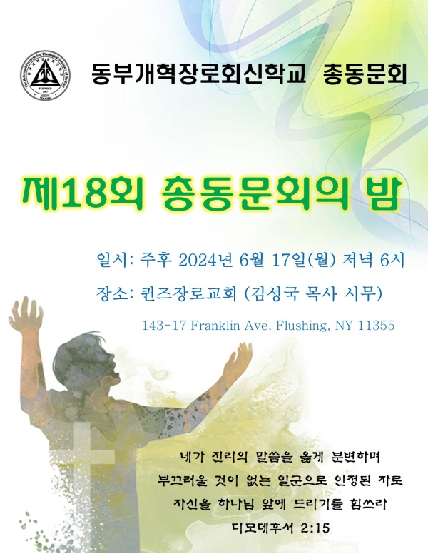 제18회 총동문회의 밤이 6월 17일(월) 오후 6시 퀸즈장로교회(김성국 목사 시무)에서 있습니다.