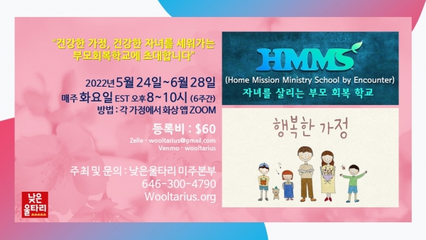 낮은울타리 미주본부(대표 : 조희창 목사)에서 <부모회복학교(HMMS)>를 화상앱 ZOOM으로 엽니다.