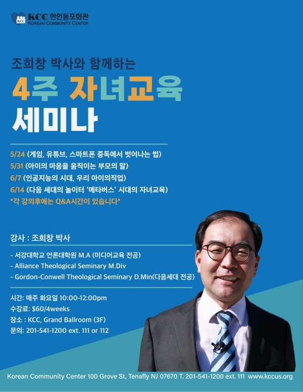 KCC(Korean Community Center) 주최로 "조희창 박사와 함께하는 4주 자녀교육세미나"가 열립니다.