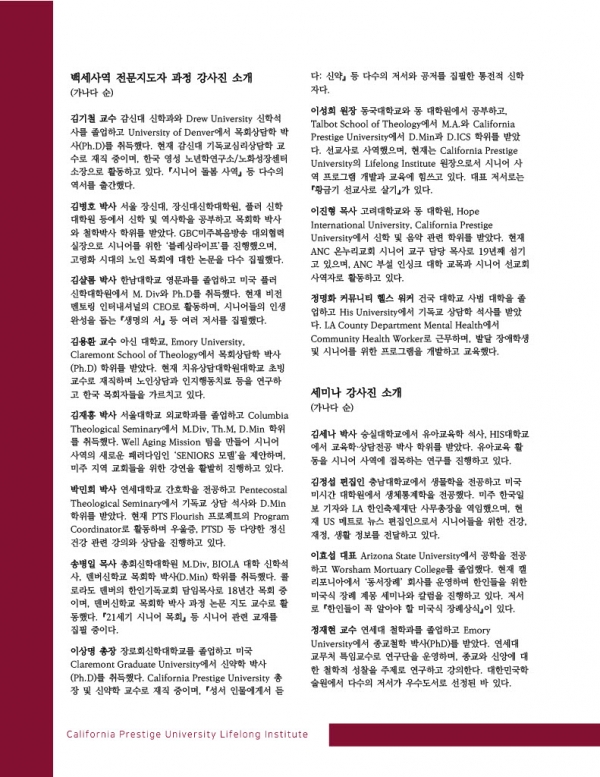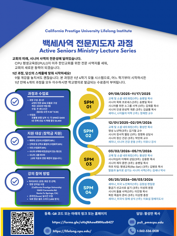 캘리포니아 프레스티지 대학교(California Prestige University, 이하 CPU) 부설 평생교육원(PULI)은 미주 한인 이민교회의 시대적 요청에 부응하고자, 오는 9월 8일(월) ‘백세사역 전문지도자 과정(Active Seniors Ministry Lecture Series)’을 개설한다고 밝혔다.