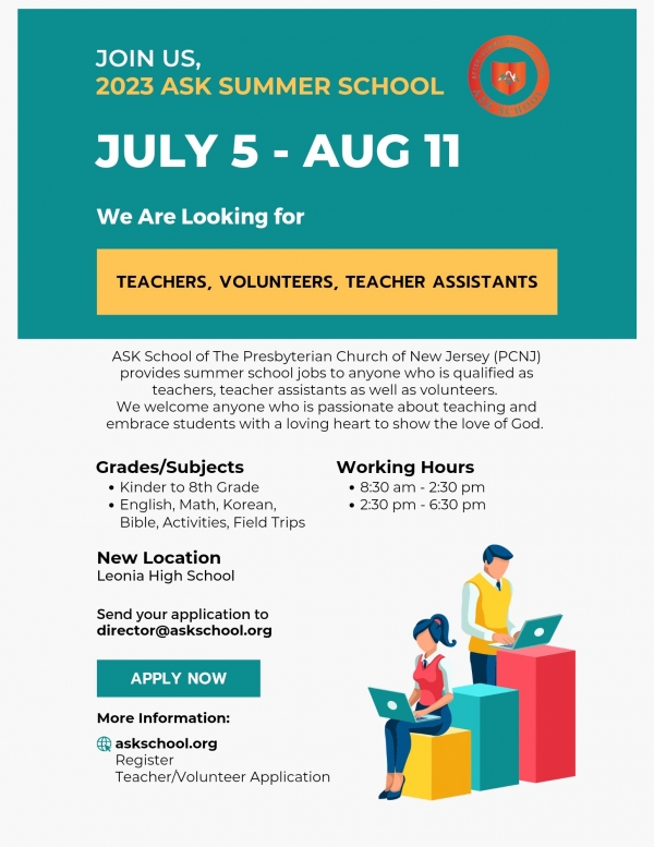 ASK SCHOOL에서 <2023년 여름학교(Summer School)>에서 다음세대들을 믿음으로 세워갈 교사를 모집합니다.