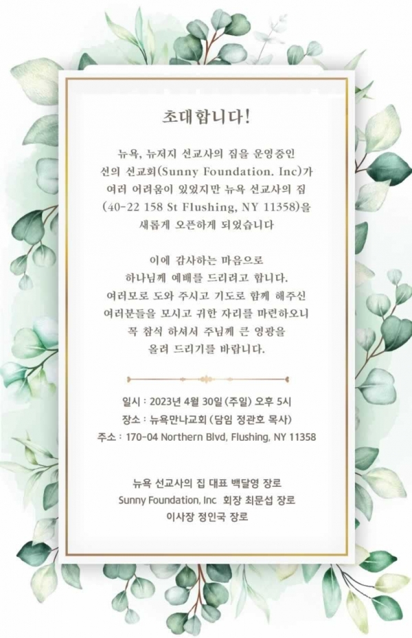 뉴욕선교사의집 리오픈 예배 페이지 정보 선교사의집ㆍ2023-04-14 관련링크 이전글 다음글 목록 본문 뉴욕선교사의집 리오픈 예배 댓글목록 등록된 댓글이 없습니다. 이전글 다음글 목록