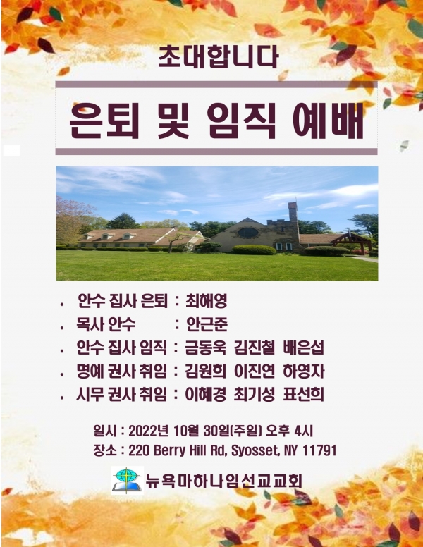 하나님의 은혜와 평강이 섬기시는 교회와 가정에 항상 충만하시기를 기원합니다. 저희 뉴욕마하나임선교교회에서 하나님의 은혜 가운데 안수 집사 은퇴 및 목사 안수, 안수 집사 그리고, 명예 권사 및 시무 권사 임직 예배를 위와 같이 갖고자 하오니 오셔서 함께 기쁨을 함께 나누시고 축하해 주시면 감사하겠습니다.