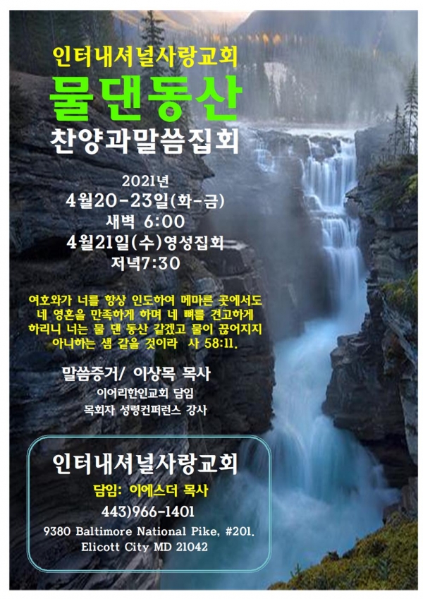 물됀동산 말씀집회와 영성집회로 인터네셔널사랑교회에서 집회를 가집니다. 많은분들 참여하셔서 내 영혼회복을 경험하시기 바랍니다. 인터내셔널사랑교회 담임 이에스더 목사님의 영성도 경험하시길 바랍니다.