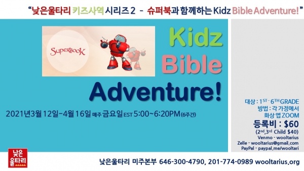 낮은울타리 미주본부(대표간사 : 조희창 목사)에서 ZOOM으로 만나는 <키즈 바이블 어드벤쳐>를 엽니다.