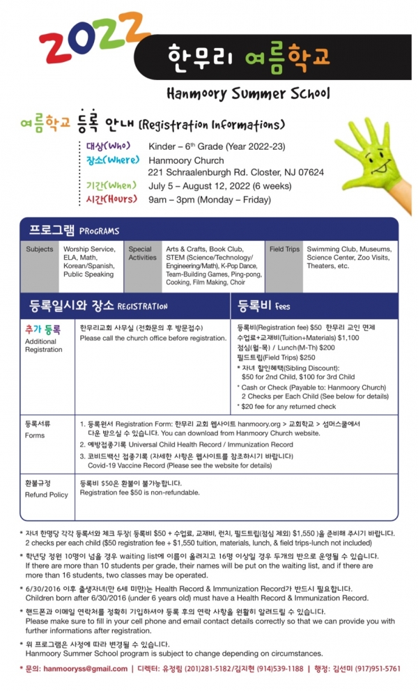 한무리 교회가 <2022 한무리 여름학교>를 오픈합니다. 자녀들에게 신앙 교육을 기반으로 한 좋은 학습 습관을 키우고, 다양하고 재미있는 경험이 남는 유익한 여름방학을 위한 탁월한 선택이 될 것입니다.