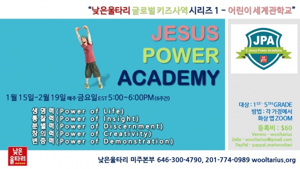 낮은울타리 미주본부(대표간사 : 조희창 목사)에서 ZOOM으로 만나는 어린이 세계관 학교 <JESUS POWER ACADEMY>를 엽니다.