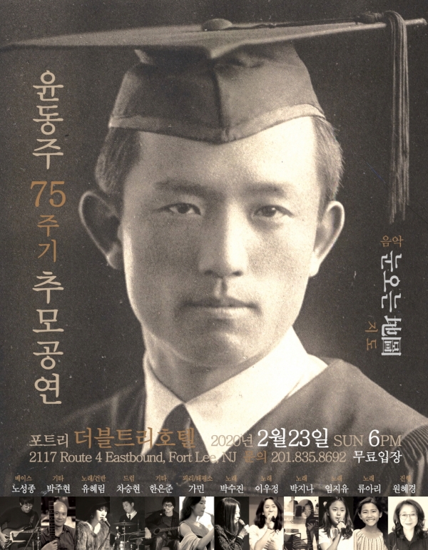 윤동주의 시로 곡을 만들어 1집 "윤동주 프로젝트 Chapter 1"을 발매하고 2007년부터 윤동주 추모공연을 미동부, 서부, 캐나다, 한국, 중국, 일본 등지에서 소소하게나마 열어오고 있는 "눈오는 지도"와 음악 친구들이 함께 모여 다시금 윤동주의 시를 노래하고 삶을 나누는 자리를 마련하였습니다. 공연을 준비해 주신, 회원없는 원혜경 후원회장님께 감사를 드립니다.