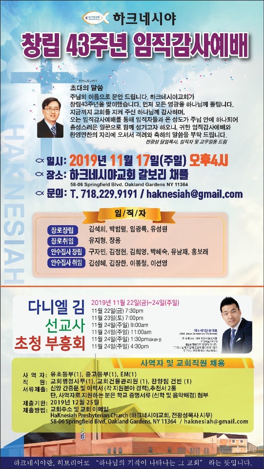 하크네시야교회 창립 43주년 임직감사예배의 자리에 여러분들을 정중히 모십니다.