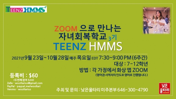 낮은울타리 미주본부(대표간사 : 조희창 목사)에서 N세대 자녀들을 위한 <자녀회복학교 TEENZ HMMS>3기를 영어과정으로 엽니다. 영어권 사역자의 인도로 영어로 진행됩니다.
