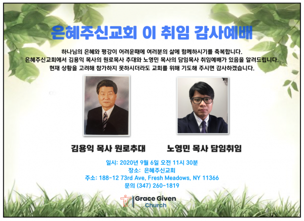 오는 9월 6일 오전 11시 30분에 은혜주신교회에서 이 취임 감사예배를 드립니다.