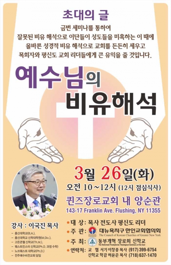 금번, 뉴욕 교협 주관과 동부개혁장로회신학교 주최로, 성경 편찬을 해오시던 이국진 목사를 초청하여 아래와 같이 목회자를 위한 세미나를 공동으로 열게 되었습니다.