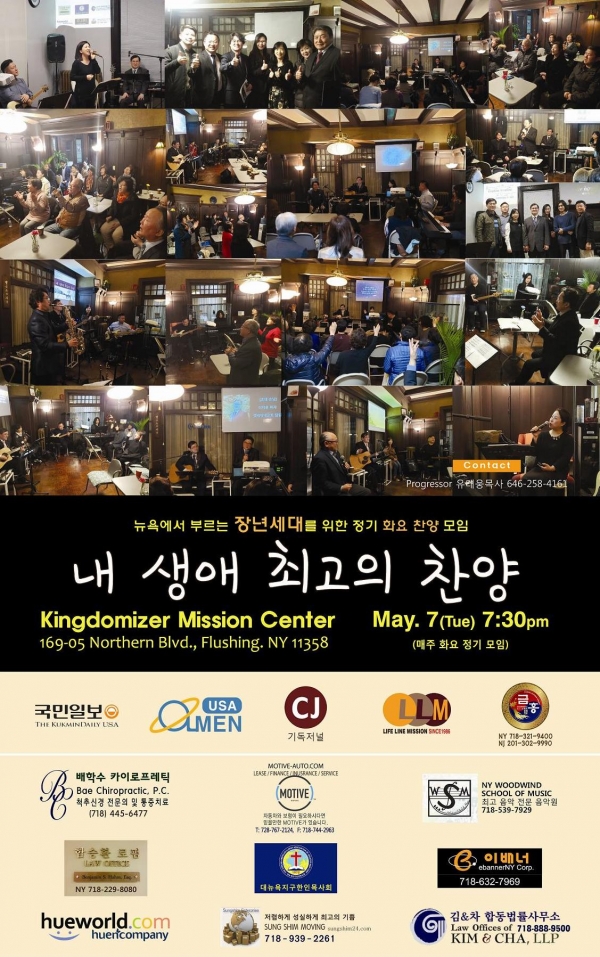 내일(5월 7일 오후 7시반) 화요찬양모임이 마무리를 하게됩니다. 뉴욕에 장년세대를 위해 영적찬양의 바람이 지속적으로 불 수 있도록 함께 동참해 주시고 힘을 더해 주시길 부탁합니다. 감사합니다.