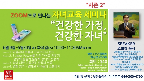 낮은울타리 미주본부(대표 : 조희창 목사)에서 "건강한 가정, 건강한 자녀"를 세워가기 원하는 부모님, 사역자님들을 위한 "Zoom으로 만나는 자녀교육세미나-시즌2"를 엽니다.