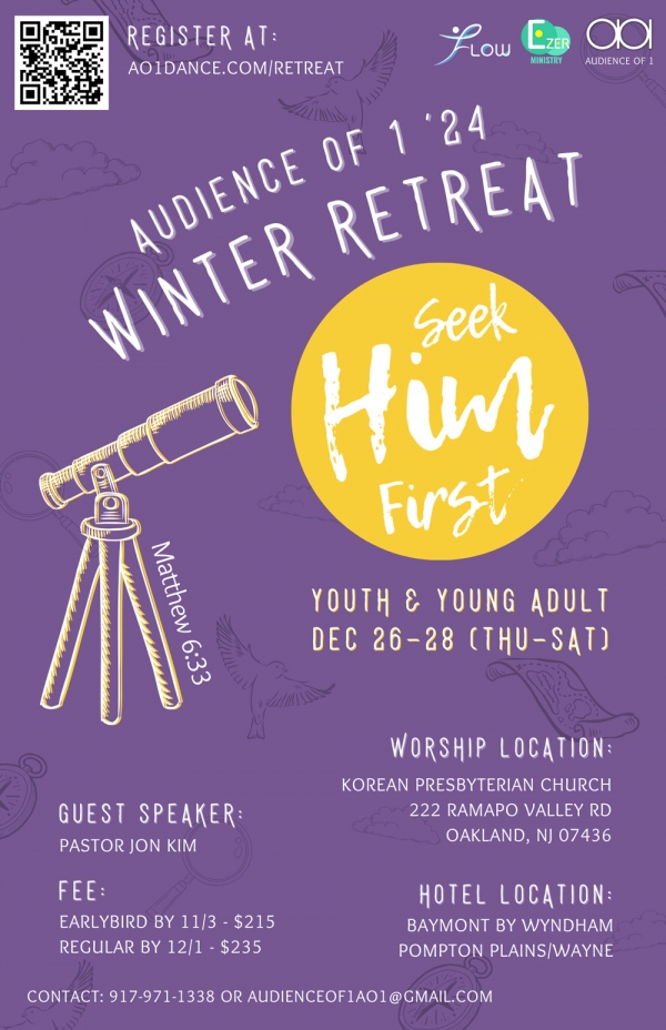 Ao1(Audience of One Ministry)에서 "먼저 그분을 찾으라(마태복음 6:33)"라는 주제로 청소년과 청년들을 위한 겨울 수양회를 개최합니다.