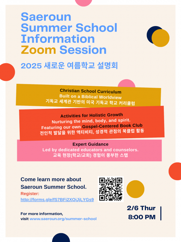 2025년 뉴저지 새로운 여름학교(Summer School)는 성경적세계관이 들어간 기독교학교 커리큘럼으로 영어(English),수학(Math),한국어(Korean) 수업을 운영합니다. 새학기 수업준비도 함께 합니다. 매일의 예배와 더불어 다양한 Activity와 Field Trip이 함께 진행됩니다.
