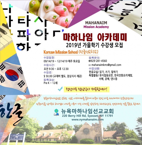 9월 14일 토요일부터 2019학년 뉴욕마하나임 선교교회 한글문화 학교를 시작됩니다. 13주간 매주 토요일에 진행되어지며 12월 14일에 마치게 됩니다.